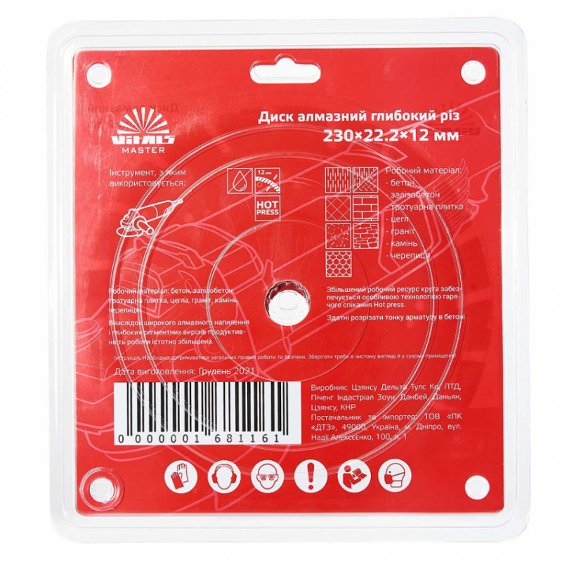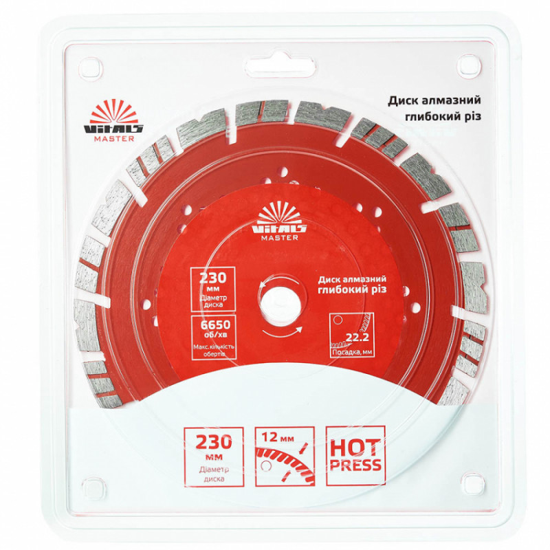 Диск алмазний Vitals Master Глибокий різ 230 мм призначений для роботи з такими будівельними матеріалами, як: бетон, залізобетон, тротуарна плитка, цегла, граніт, камінь, черепиця.