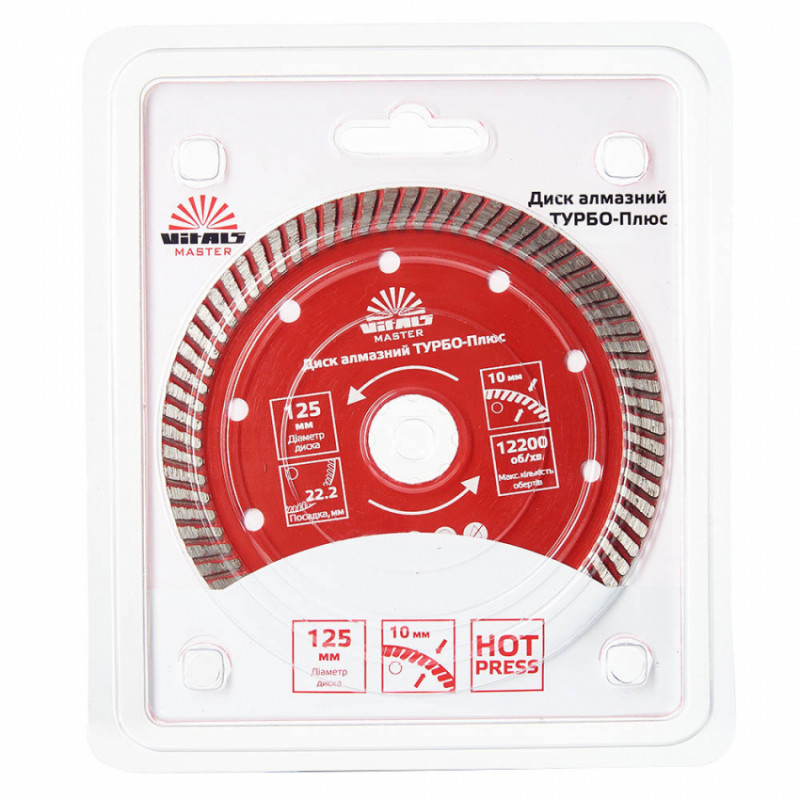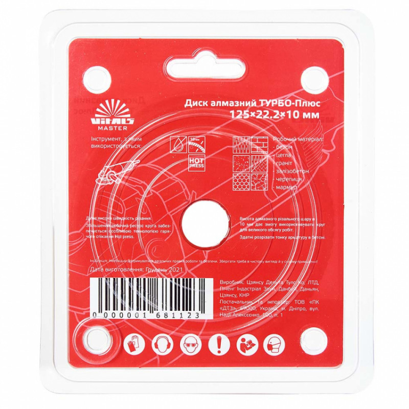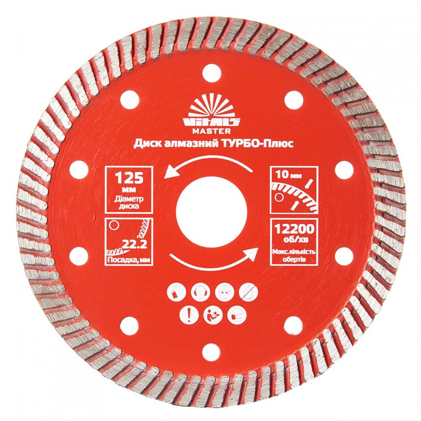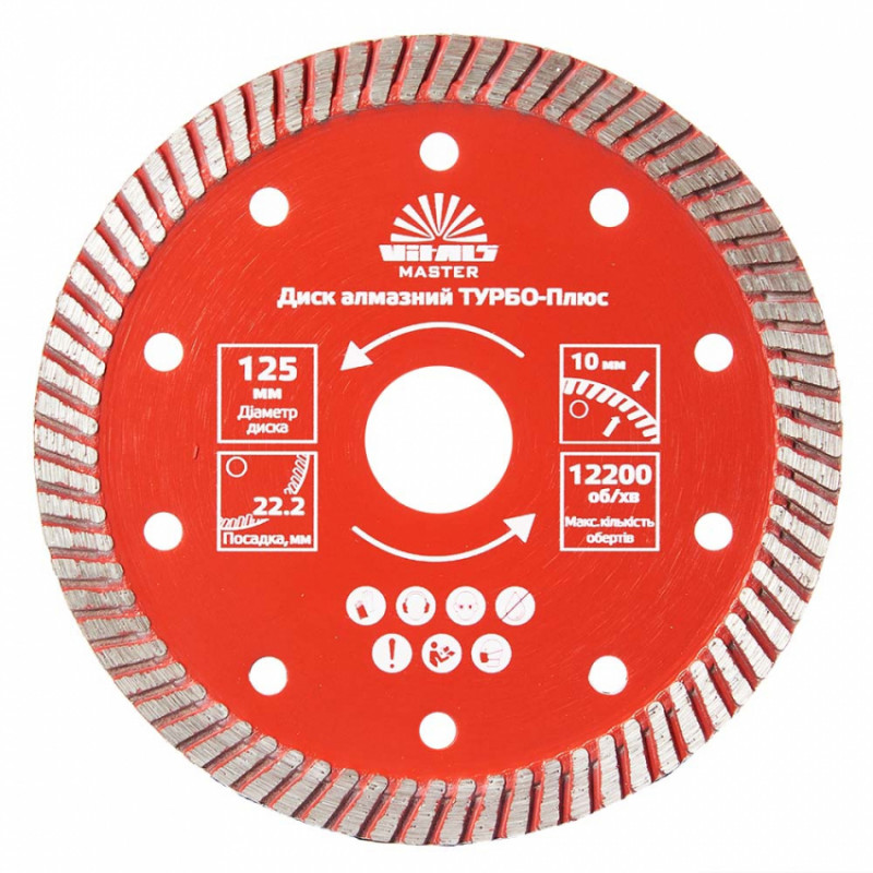 Диск алмазний Vitals Master ТУРБО-Плюс 125 мм використовується для роботи з такими матеріалами, як: бетон, цегла, граніт, залізобетон, черепиця, мармур. Висота алмазного різального шару становить 10 мм, що дає змогу використовувати круг для великого обсягу робіт.