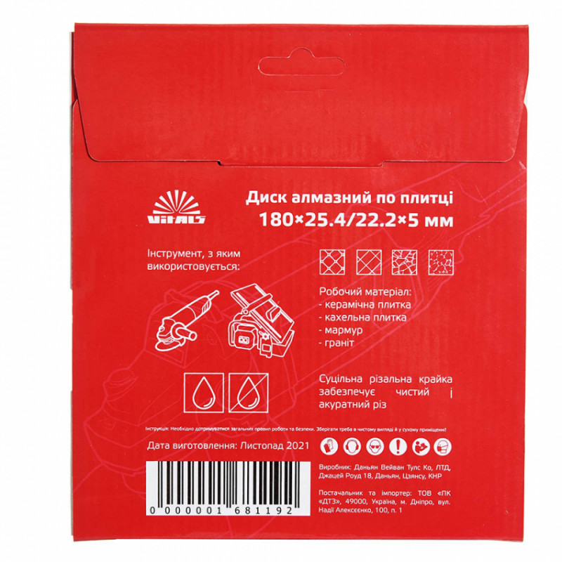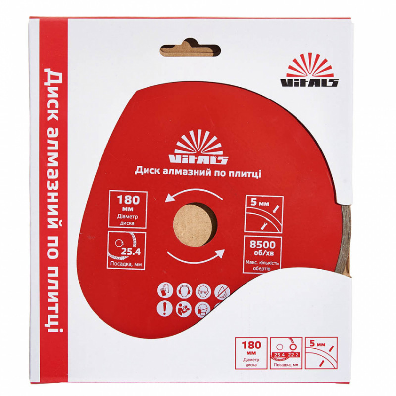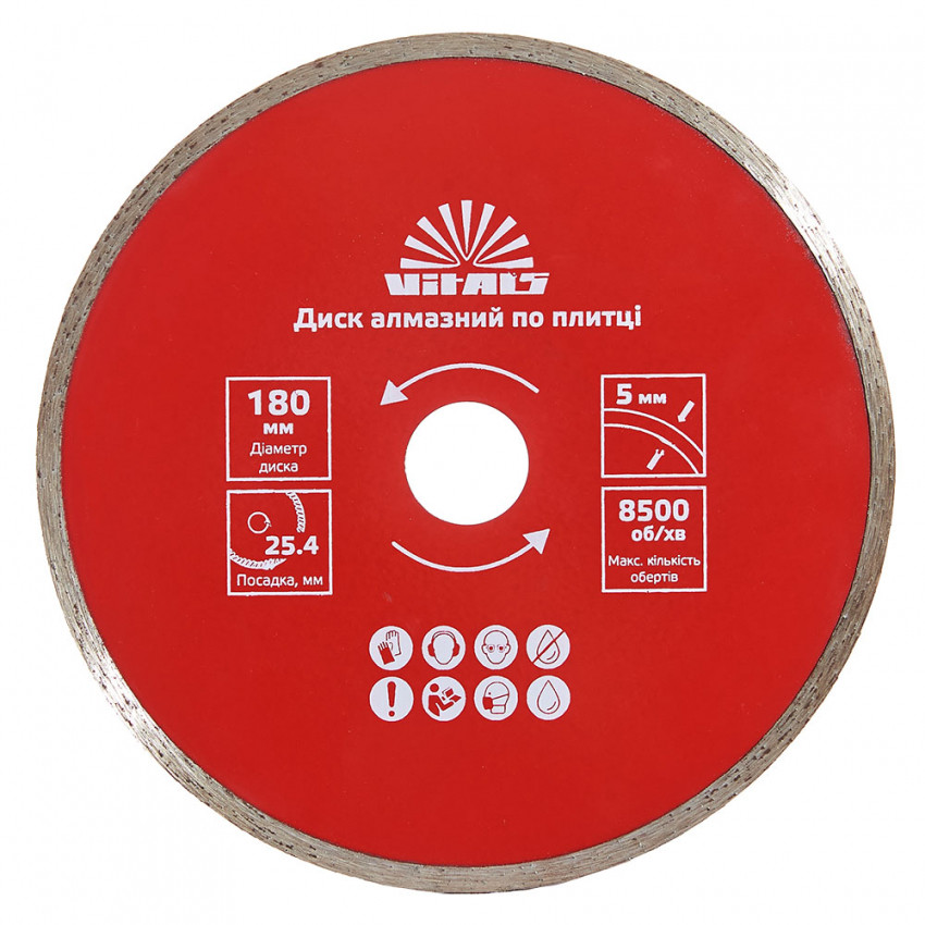 Алмазний диск Vitals по плитці 180х25.4/22.2х5 мм призначений для різання керамічної плитки, кахельної плитки, мармуру та граніту. Цей диск виконує акуратний рівний різ оброблюваного матеріалу без сколів. Для підвищення ефективності рекомендується виконання різання з водяним охолодженням. Ефективність роботи залежить від правильно підібраного діаметра диска. Для плиткорізу – 180 мм, а для УШМ – 125 або 230 мм.
