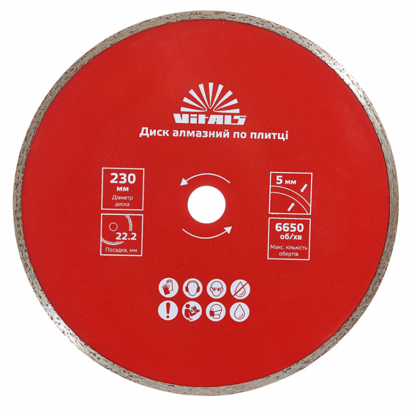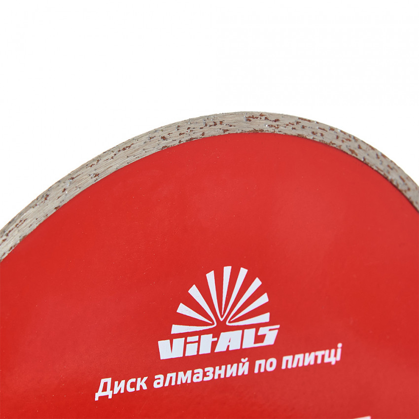 Алмазний диск Vitals по плитці 230х22.2х5 мм призначений для різання керамічної плитки, кахельної плитки, мармуру та граніту. Цей диск виконує акуратний рівний різ оброблюваного матеріалу без сколів. Для підвищення ефективності рекомендується виконання різання з водяним охолодженням. Ефективність роботи залежить від правильно підібраного діаметра диска. Для плиткорізу – 180 мм, а для УШМ – 125 або 230 мм.