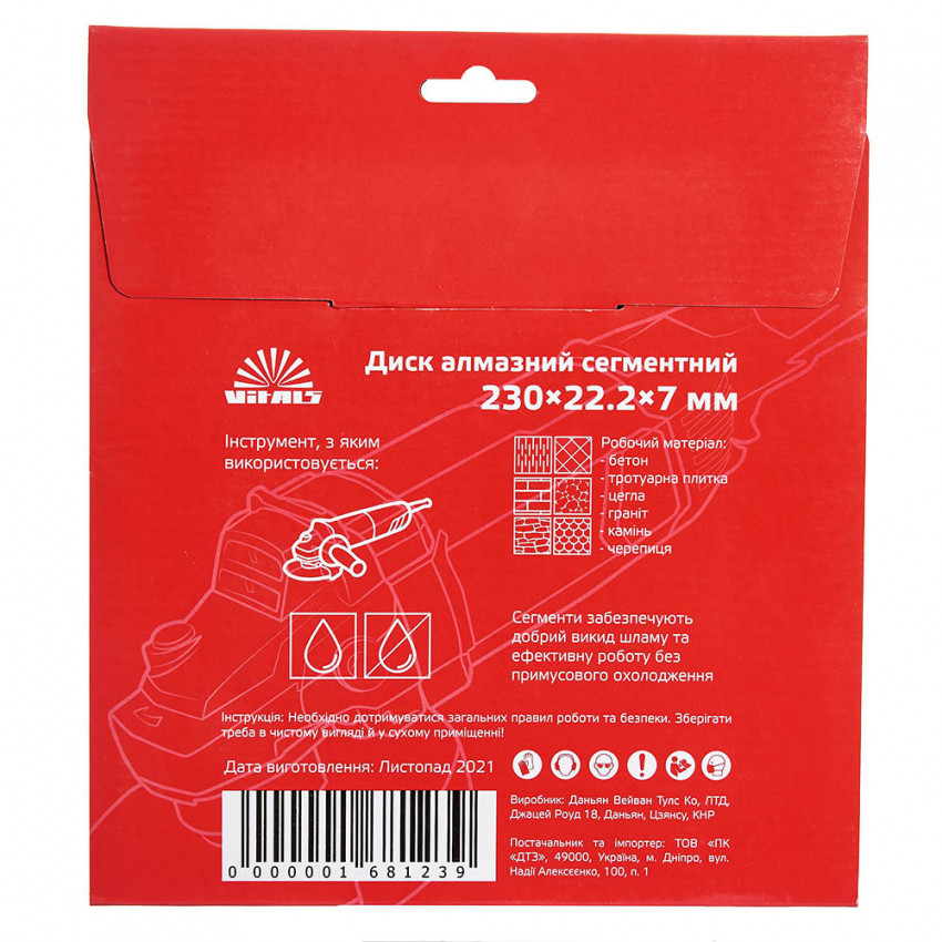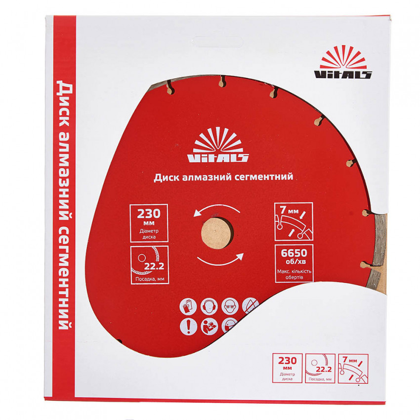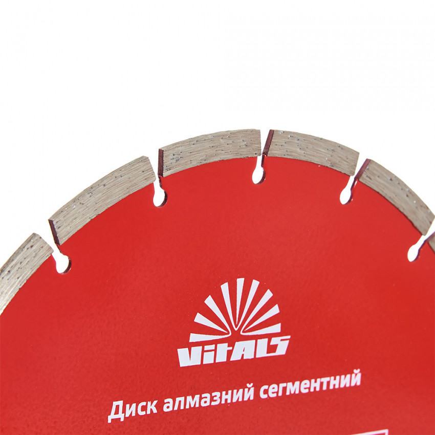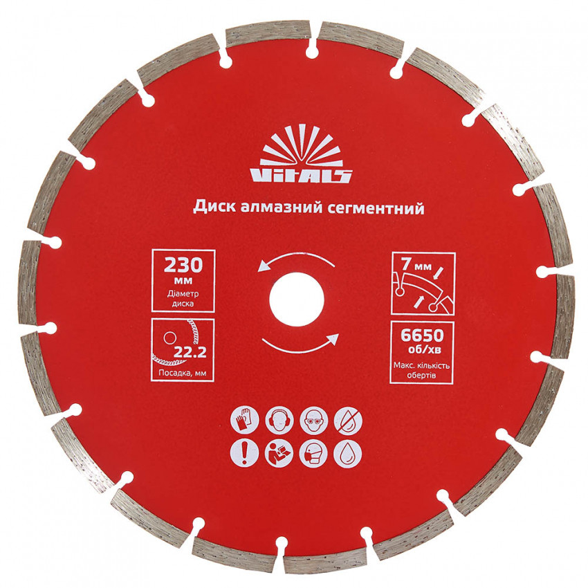Алмазний диск Vitals сегментний 230х22.2х7 мм призначений для різання бетону, тротуарної плитки, цегли, граніту, каменю та черепиці. Швидкість різу збільшена за рахунок сегментних вирізів у структурі диска. При цьому диск не потребує примусового водяного охолодження. Ефективність роботи залежить від правильно підібраного діаметра диска: 125, 180 або 230 мм.