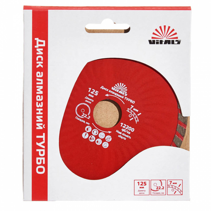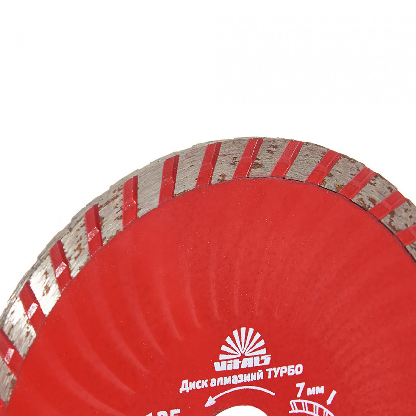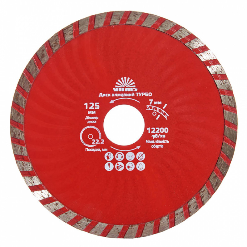 Алмазний диск Vitals ТУРБО 125х22.2х7 мм застосовується для різання бетону, цегли, граніту, залізобетону та черепиці. Диск має хвилеподібну кромку, завдяки якій має більше матеріалів, які здатні різати. Ріжучі грані у структурі диска під спрямовані під кутом, що підвищує його охолодження під час роботи. Ефективність роботи залежить від правильно підібраного діаметра диска: 125, 180 або 230 мм.