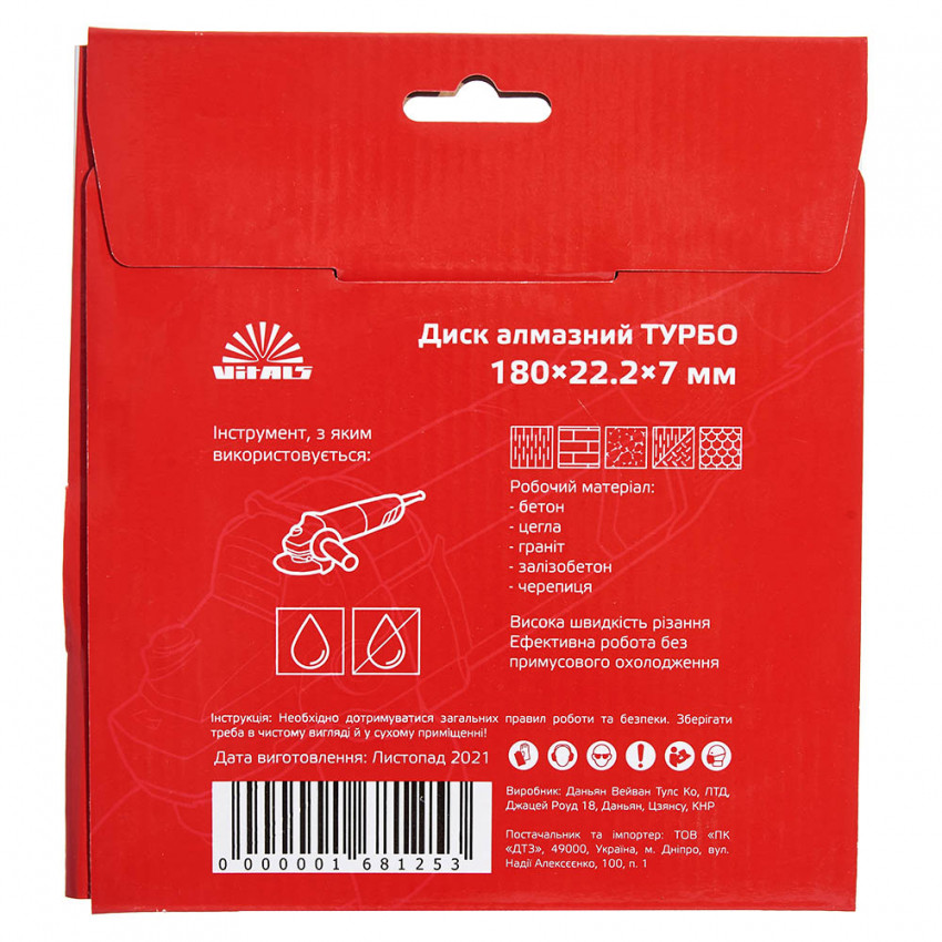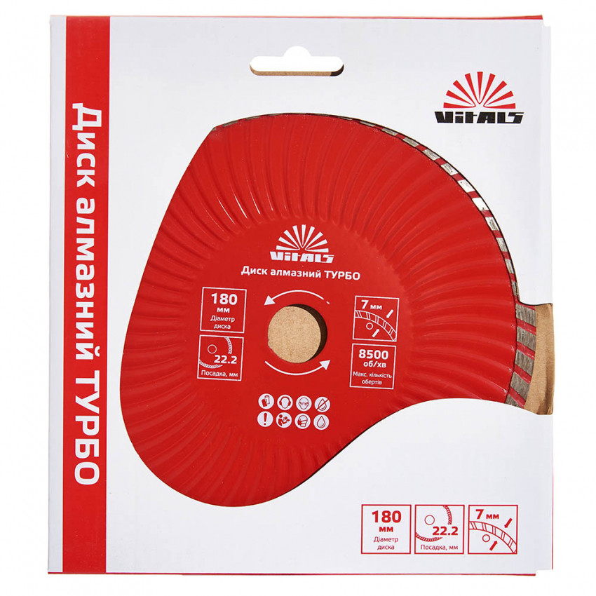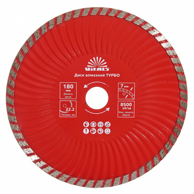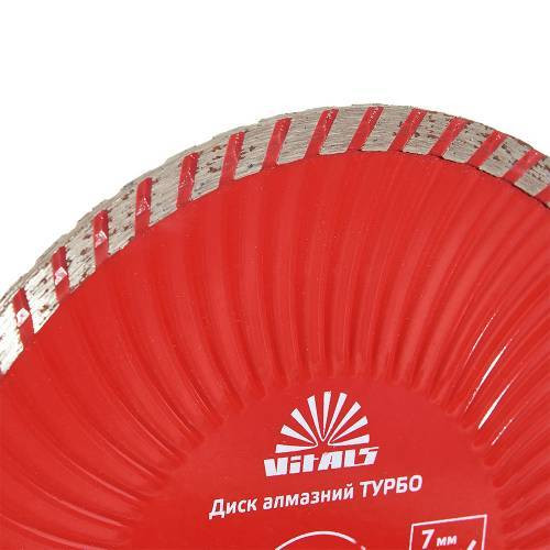 Алмазний диск Vitals ТУРБО 180х22.2х7 мм застосовується для різання бетону, цегли, граніту, залізобетону та черепиці. Диск має хвилеподібну кромку, завдяки якій має більше матеріалів, які здатні різати. Ріжучі грані у структурі диска під спрямовані під кутом, що підвищує його охолодження під час роботи. Ефективність роботи залежить від правильно підібраного діаметра диска: 125, 180 або 230 мм.