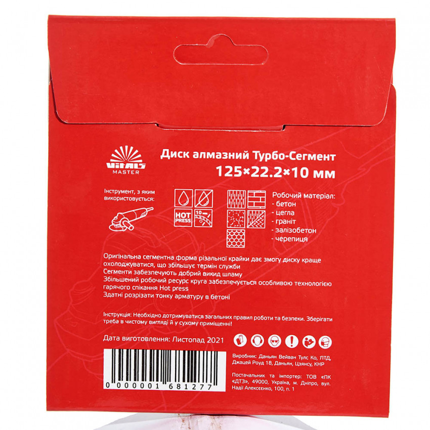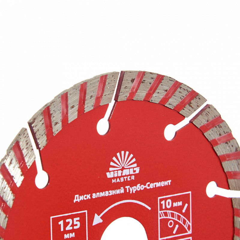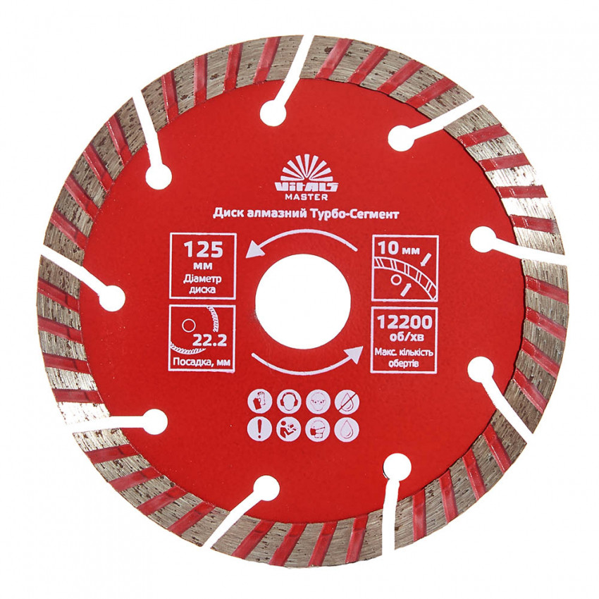 Алмазний диск Vitals Master Турбо-Сегмент 125×22.2×10 мм призначений для ефективного різання по бетону, цеглы, граніту, залізобетону та черепиці. Завдяки високим якісним показникам здатний розрізати тонку арматуру в бетоні.