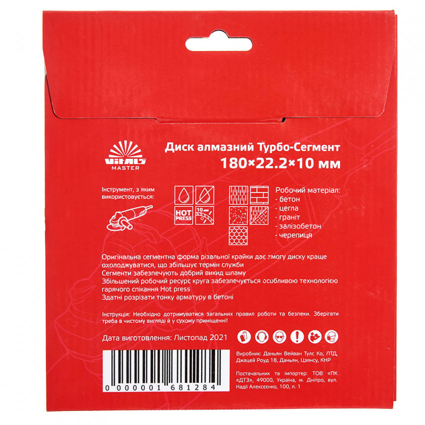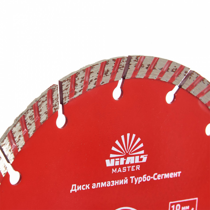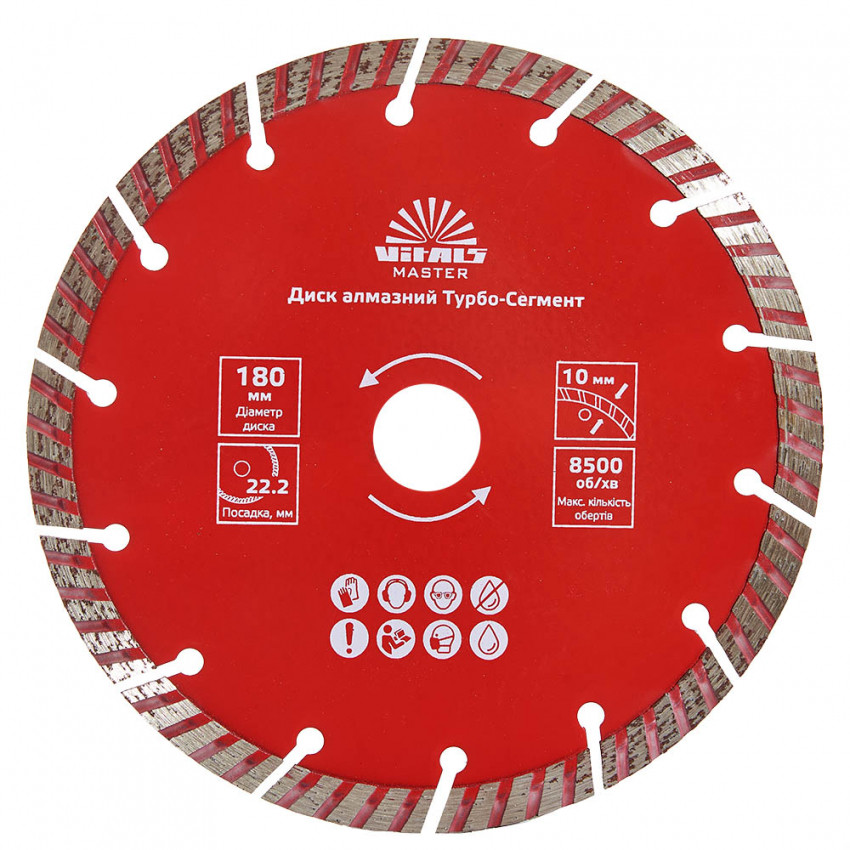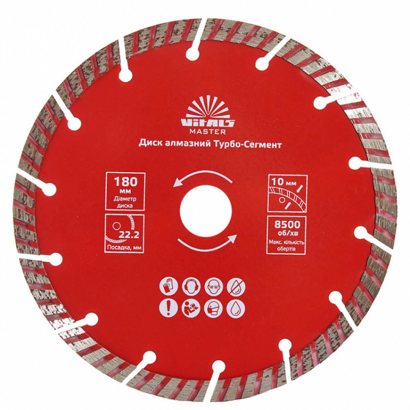 Алмазний диск Vitals Master Турбо-Сегмент 180×22.2×10 мм призначений для ефективного різання по бетону, цеглы, граніту, залізобетону та черепиці. Завдяки високим якісним показникам здатний розрізати тонку арматуру в бетоні.