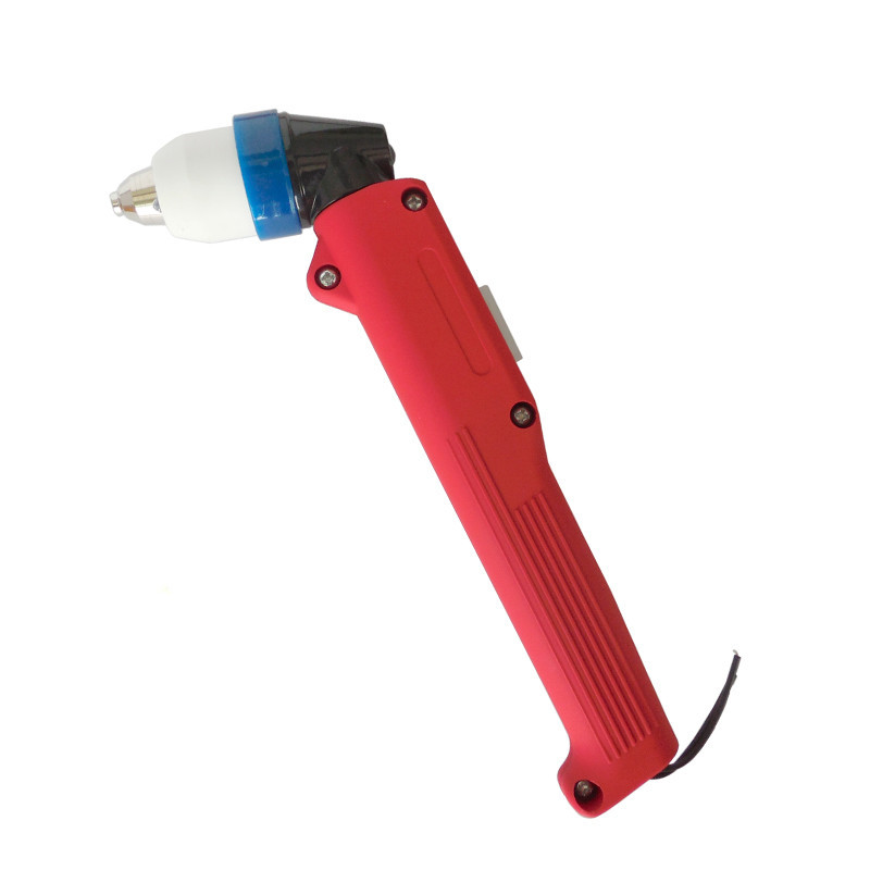 Обратите внимание - это головка плазмотрона для ручной резки, о чем говорит Г-образная форма рукояти, спроектированная с учетом того, чтобы человеку было удобно держать ее рукой и направлять поток плазмы.
