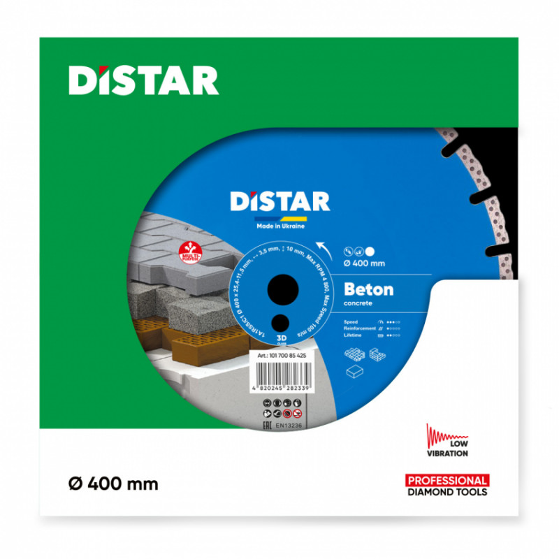 Алмазный отрезной круг Distar Beton – это универсальный диск для работы с любыми типами бетона. Стоит отметить, что его использование допустимо как при работе с неармированным, так и с армированным бетоном любого типа. В целом, инструмент универсален в применении, и может быть использован для резания различных строительных материалов.