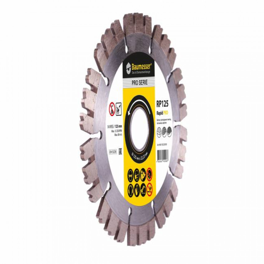 Алмазний диск RAPID – це передовий продукт для швидкісного виконання робіт. Призначений для різання різних будівельних матеріалів, таких як армований бетон, тротуарна плитка, цегла, піщаник. Також диск здатний працювати із різними гранітами. Його агресивна форма сегментів забезпечує підвищену швидкість різання. Товщина алмазних сегментів становить 2,0 мм, що менше товщини сегментів більшості представлених на ринку дисків. Крім підвищеної швидкості, така товщина створює меншу ширину прорізу, менше перемелює оброблюваний матеріал у шлам, а відповідно, створює менший об'єм пилу. За всіх своїх вигідних характеристик коло має доступну демократичну ціну. Диск випускається зовнішнім діаметром 125 мм із посадковим отвором 22,2 мм. Застосовується на кутошліфувальних машинах (болграках) без використання охолодження.