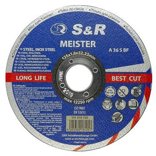 О продукте Круг отрезной S&R Meister 125x1.6x22.2 мм A36S BF мет/нерж.